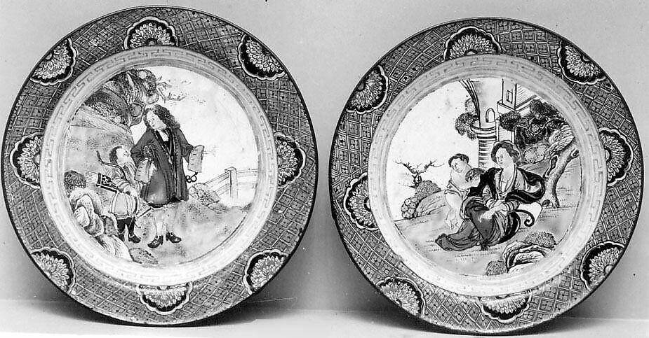 The European interest in and reworking of Chinese designs and themes in the late seventeenth and eighteenth centuries is often known by the French term chinoiserie, which can be translated as "Chinese-like." While there is no such term for the reverse trend of Chinese interest in European art, figures such as the man and boy on this dish attest to the knowledge in China of European imagery, possibly inspired by prints.