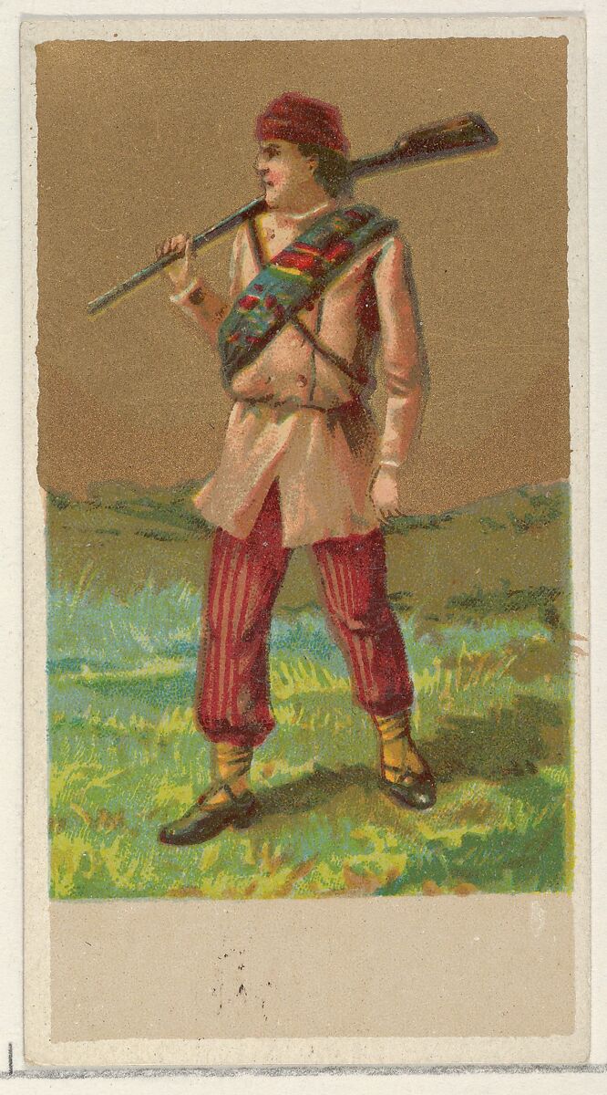 Trade cards from the "Natives in Costume" series (N16), issued in 1886 in a set of 50 cards to promote Allen & Ginter brand cigarettes. Secondary set from original Allen & Ginter plates printed by Teofani and distributed in Iceland. This set is printed on thinner card stock and does not have printed text on recto or verso.