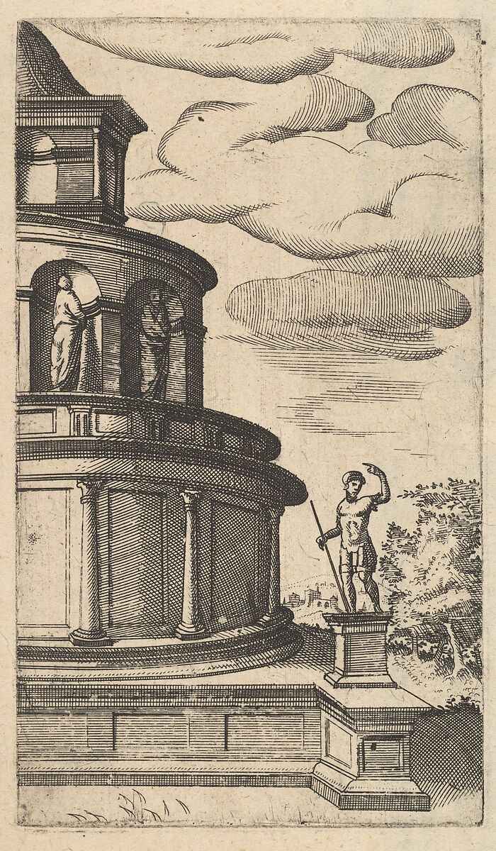 Perspectival depiction of part of the mausoleum of Emperor Hadrian. The building is characterized by its central plan consisting of two circular floors on a rectangular base. The building is crowned by a rectangular (?) lantern. A statue of a Roman soldier is placed on the right corner of the base of the building. Two other statues are placed in semi-circular niches on the second floor. While the building is meant to represent Hadrian’s Tomb, still preserved as the Castel Sant’Angelo today, this rendition was likely created as an ekphrasis, without extensive knowledge of the remains of the original.