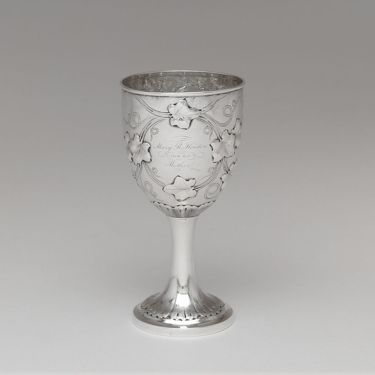 This goblet, one of a pair (1970.200.3), and a matching pitcher (1970.200.2) are decorated with a grapevine motif chased in repoussé and ruffled leaves that recall eighteenth-century rococo ornament. The set originally belonged to the donor’s grandmother Grizelda Gilchrist Polk, who married Russell Houston, chief attorney for the Louisville-Nashville Railroad. Her monogram, "GGH," is engraved on the front of the pitcher. The goblets are inscribed to two other members of the Polk-Houston family.