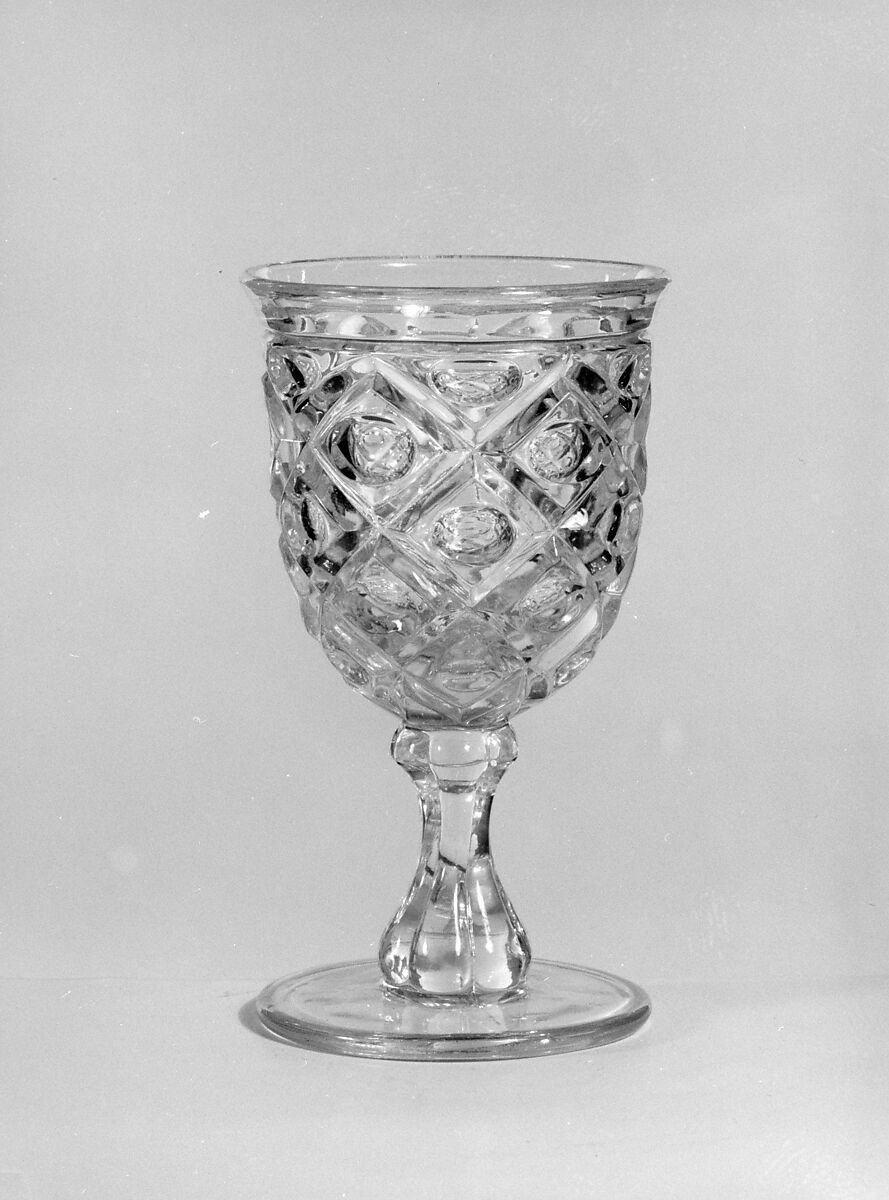With the development of new formulas and techniques, glass-pressing technology had improved markedly by the late 1840s. By this time, pressed tablewares were being produced in large matching sets and innumerable forms. During the mid-1850s, colorless glass and simple geometric patterns dominated. Catering to the demand for moderately-priced dining wares, the glass industry in the United States expanded widely, and numerous factories supplied less expensive pressed glassware to the growing market. At the Exhibition of the Industry of All Nations at New York’s Crystal Palace in 1853, for example, the New England Glass Company exhibited 130 pieces of one design, "consisting of bowls, tumblers, champagnes, wines, and jelly glasses." This object belongs to one such service. Although the glass manufactory is not known, the glassware is very typical of the large services that were very popular with America’s middle class in the nineteenth century.