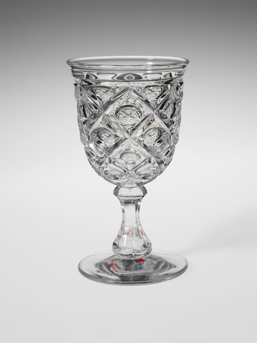 With the development of new formulas and techniques, glass-pressing technology had improved markedly by the late 1840s. By this time, pressed tablewares were being produced in large matching sets and innumerable forms. During the mid-1850s, colorless glass and simple geometric patterns dominated. Catering to the demand for moderately-priced dining wares, the glass industry in the United States expanded widely, and numerous factories supplied less expensive pressed glassware to the growing market. At the Exhibition of the Industry of All Nations at New York’s Crystal Palace in 1853, for example, the New England Glass Company exhibited 130 pieces of one design, "consisting of bowls, tumblers, champagnes, wines, and jelly glasses." This object belongs to one such service. Although the glass manufactory is not known, the glassware is very typical of the large services that were very popular with America’s middle class in the nineteenth century.