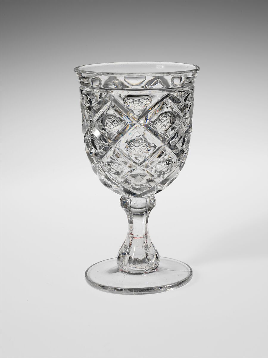 With the development of new formulas and techniques, glass-pressing technology had improved markedly by the late 1840s. By this time, pressed tablewares were being produced in large matching sets and innumerable forms. During the mid-1850s, colorless glass and simple geometric patterns dominated. Catering to the demand for moderately-priced dining wares, the glass industry in the United States expanded widely, and numerous factories supplied less expensive pressed glassware to the growing market. At the Exhibition of the Industry of All Nations at New York’s Crystal Palace in 1853, for example, the New England Glass Company exhibited 130 pieces of one design, "consisting of bowls, tumblers, champagnes, wines, and jelly glasses." This object belongs to one such service. Although the glass manufactory is not known, the glassware is very typical of the large services that were very popular with America’s middle class in the nineteenth century.