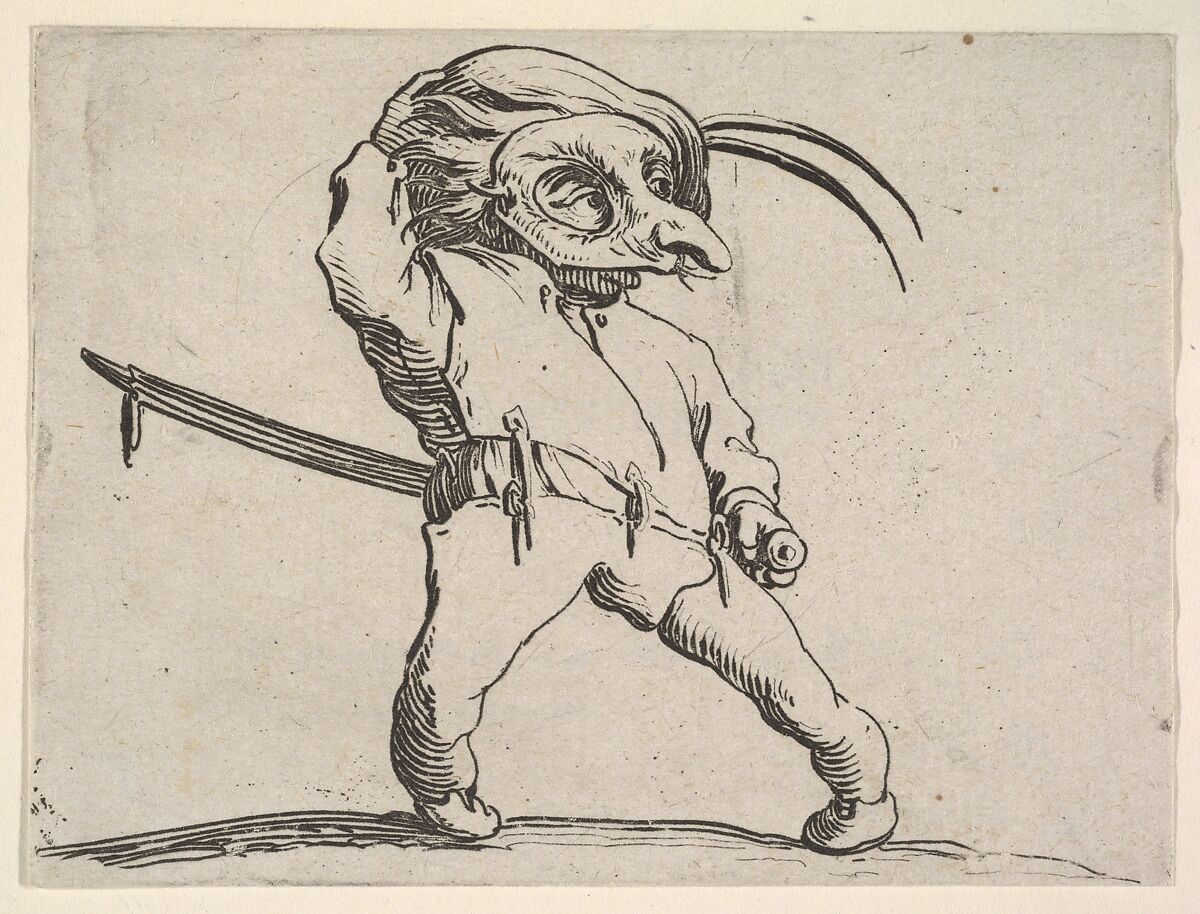 - Title:Masked, small male figure with right hand grasping hat and left hand grasping sword hilt, from "Varie Figure Gobbi"