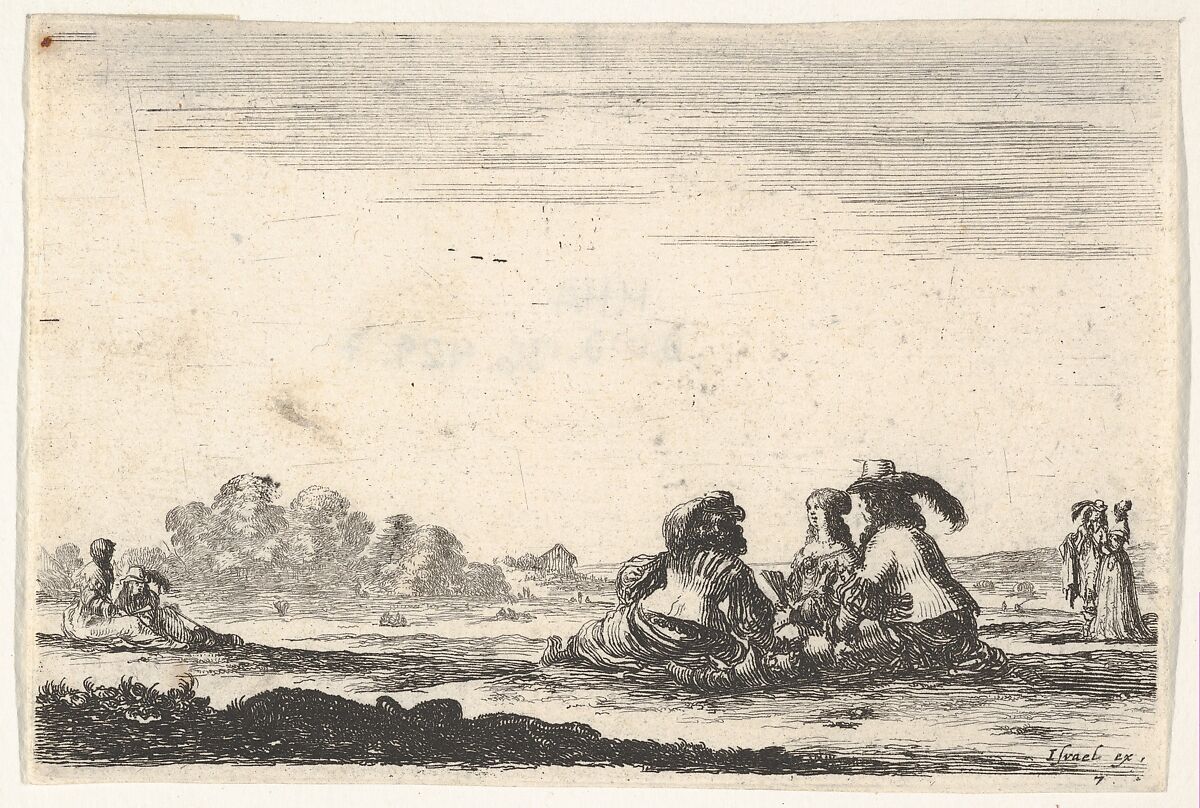- Title: Plate 7: Two noblemen seated in center, seen from behind, conversing with a noblewoman seated between them, a noblewoman and man seated to left in background and standing to right in background, from "Various Figures" (Agréable diversité de figures)
