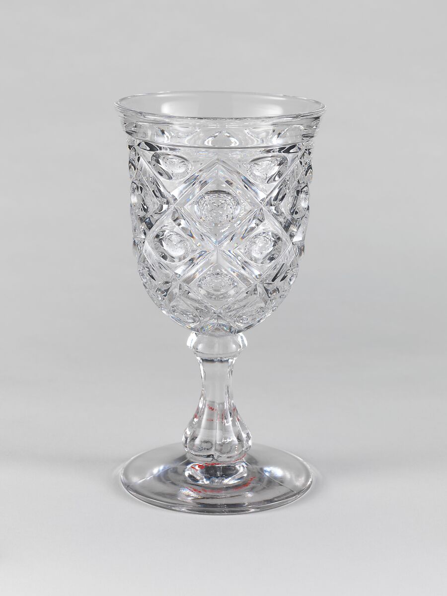 With the development of new formulas and techniques, glass-pressing technology had improved markedly by the late 1840s. By this time, pressed tablewares were being produced in large matching sets and innumerable forms. During the mid-1850s, colorless glass and simple geometric patterns dominated. Catering to the demand for moderately-priced dining wares, the glass industry in the United States expanded widely, and numerous factories supplied less expensive pressed glassware to the growing market. At the Exhibition of the Industry of All Nations at New York’s Crystal Palace in 1853, for example, the New England Glass Company exhibited 130 pieces of one design, "consisting of bowls, tumblers, champagnes, wines, and jelly glasses." This object belongs to one such service. Although the glass manufactory is not known, the glassware is very typical of the large services that were very popular with America’s middle class in the nineteenth century.