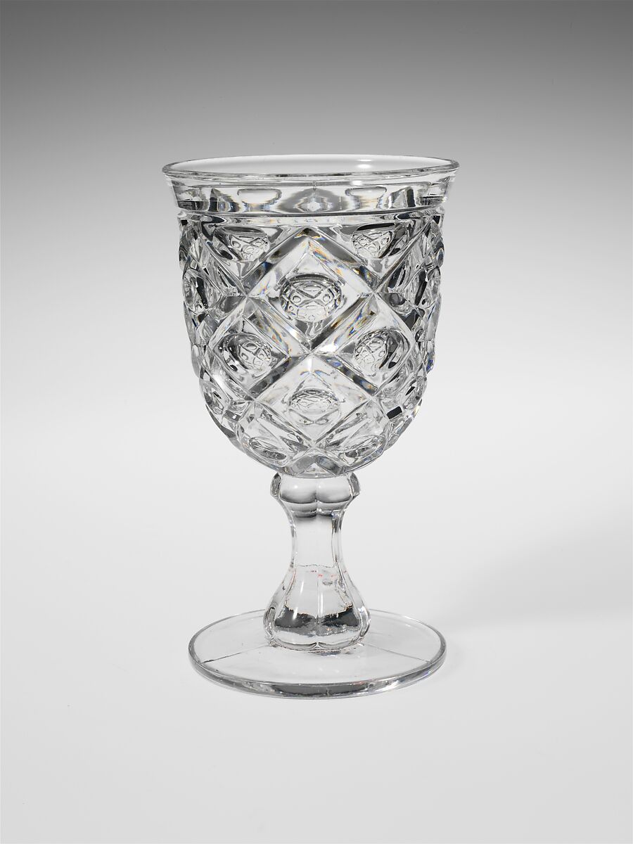 With the development of new formulas and techniques, glass-pressing technology had improved markedly by the late 1840s. By this time, pressed tablewares were being produced in large matching sets and innumerable forms. During the mid-1850s, colorless glass and simple geometric patterns dominated. Catering to the demand for moderately-priced dining wares, the glass industry in the United States expanded widely, and numerous factories supplied less expensive pressed glassware to the growing market. At the Exhibition of the Industry of All Nations at New York’s Crystal Palace in 1853, for example, the New England Glass Company exhibited 130 pieces of one design, "consisting of bowls, tumblers, champagnes, wines, and jelly glasses." This object belongs to one such service. Although the glass manufactory is not known, the glassware is very typical of the large services that were very popular with America’s middle class in the nineteenth century.