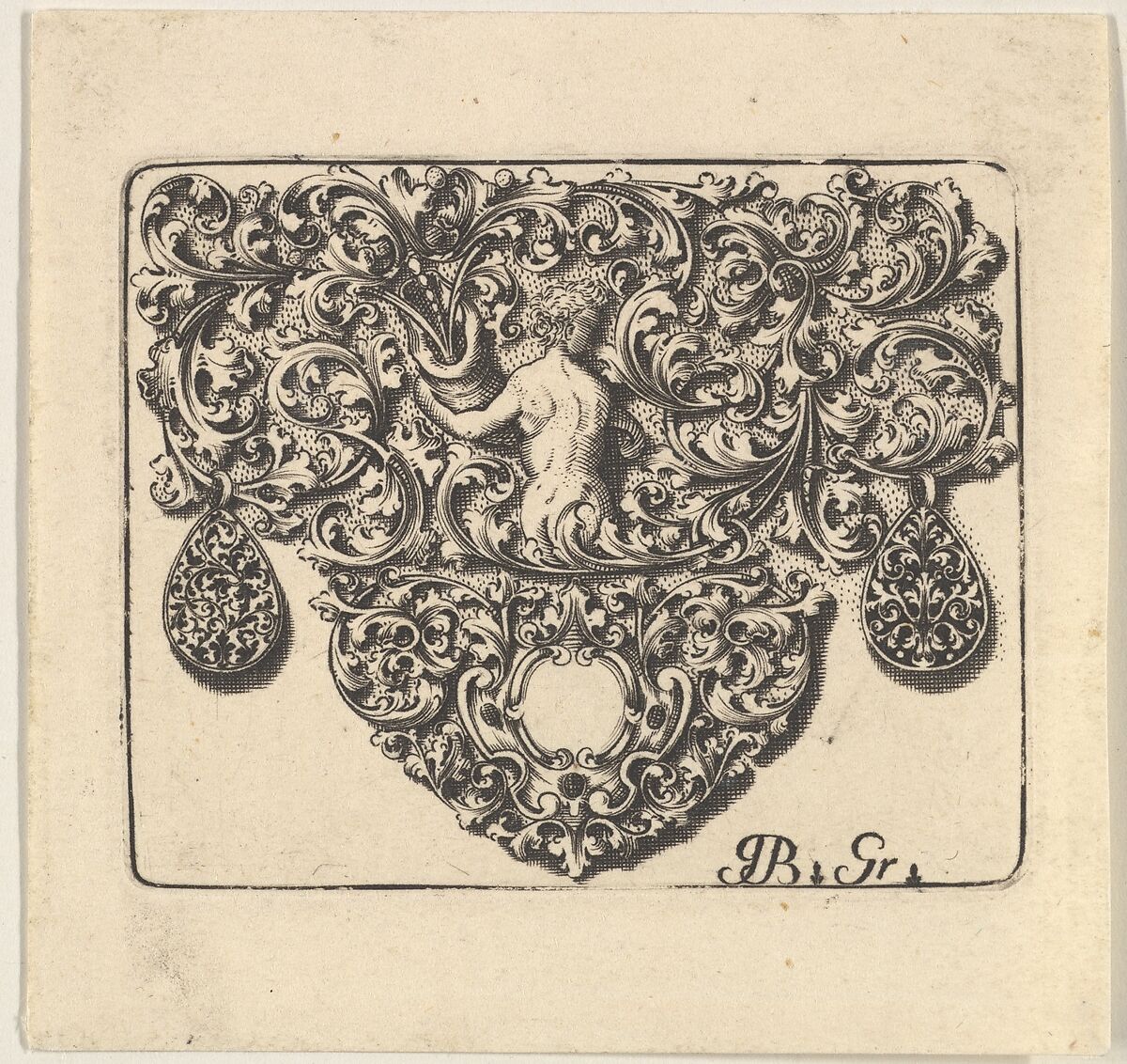 Small ornament print with a design mainly made up out of acathus wreaths, with in the middle the figure of a young man, emerging from the wreaths and seen from the back, who carries a cornucopia. On the right and left side a small pendant is attached filled with blackwork, both in the silhouette style and in white on a black ground.