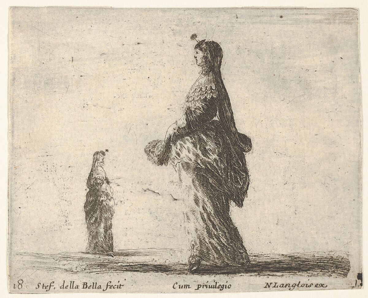 - Title:Plate 18: a noblewoman walking towards the left with a feathered fan, another woman in background to left, from "Diversi Capricci"