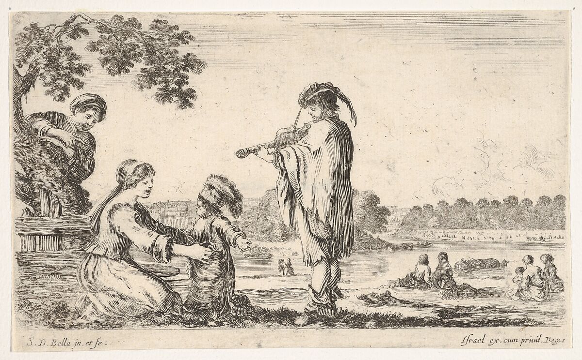 - Title: A man playing the violin in center, turned towards the left in profile, a seated woman to left playing with her dancing child, another woman standing and pointing behind a tree to left, seated women in a landscape to right in the background, from "Various figures and lands" (Diverse figure e paesi)