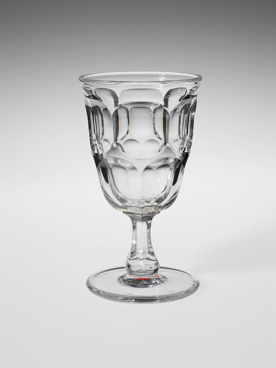 With the development of new formulas and techniques, glass-pressing technology had improved markedly by the late 1840s. By this time, pressed tablewares were being produced in large matching sets and innumerable forms. During the mid-1850s, colorless glass and simple geometric patterns dominated. Catering to the demand for moderately-priced dining wares, the glass industry in the United States expanded widely, and numerous factories supplied less expensive pressed glassware to the growing market. At the Exhibition of the Industry of All Nations at New York’s Crystal Palace in 1853, for example, the New England Glass Company exhibited 130 pieces of one design, "consisting of bowls, tumblers, champagnes, wines, and jelly glasses." This object belongs to one such service. Although the glass manufactory is not known, the glassware is very typical of the large services that were very popular with America’s middle class in the nineteenth century.