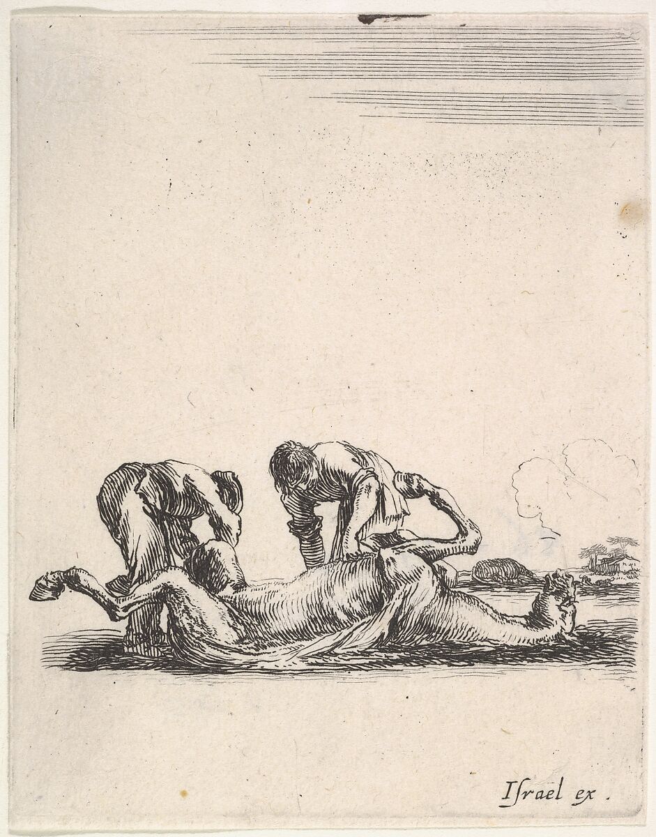 - Title: Two men skinning a horse that is lying on the ground with its hooves in the air, from "Various cavalry exercises" (Diverses exercices de cavalerie)