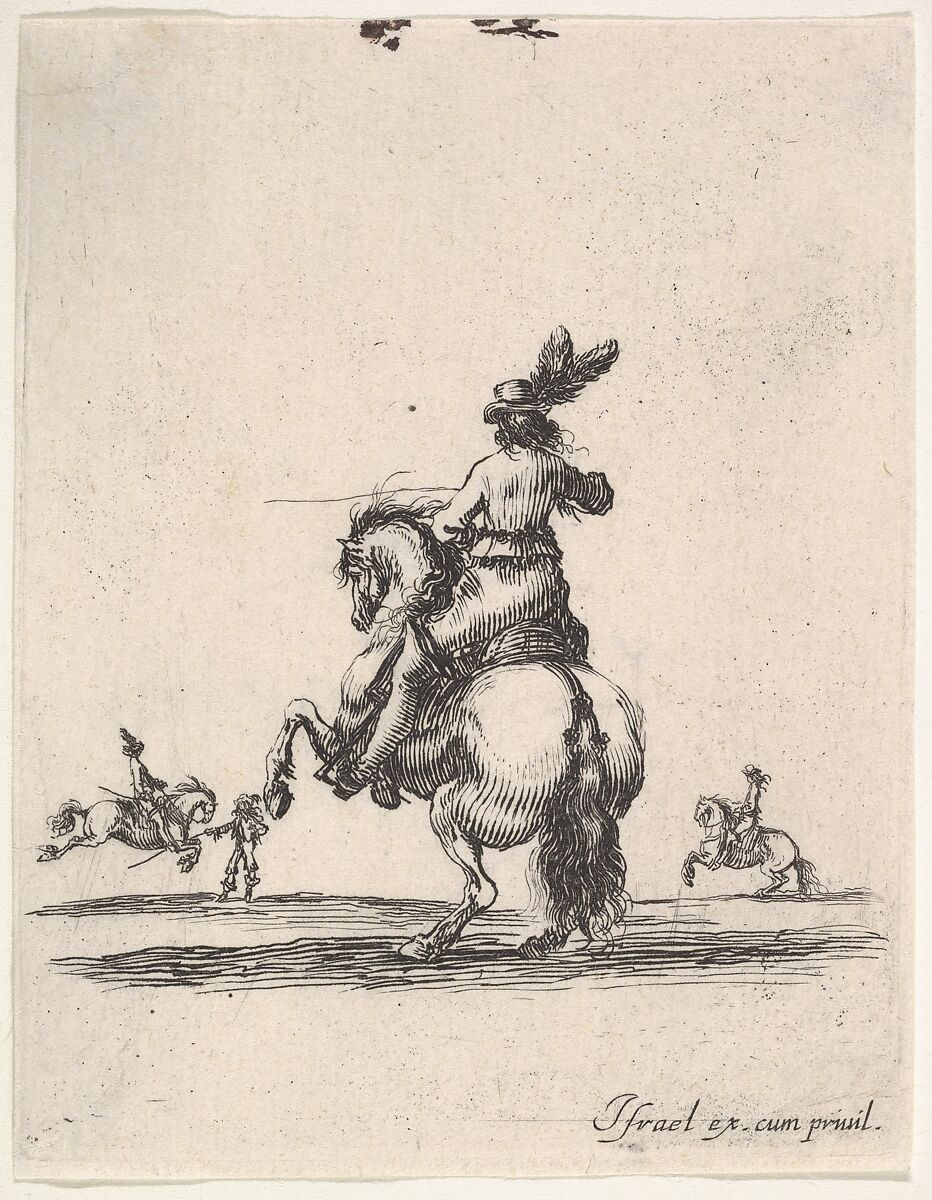 - Title: A horseman atop a rearing horse, seen from behind and turned towards the left, two horsemen in the background, from "Various cavalry exercises" (Diverses exercices de cavalerie)
