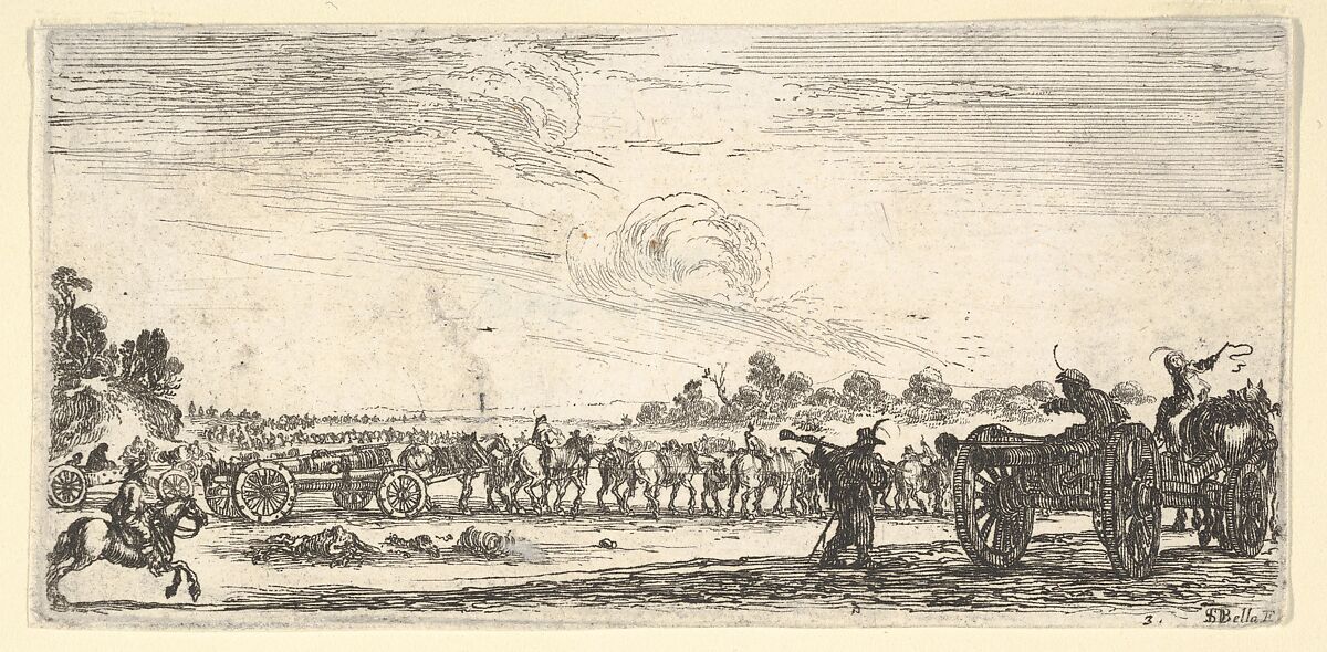 - Title:Plate 3: a procession of horse-drawn cannons, riding to the right, a horse-drawn cannon to the right seen from the back, from "Troops, cannons, and attacks on towns" (Dessins de quelques conduites de troupes, canons, et ataques de villes)