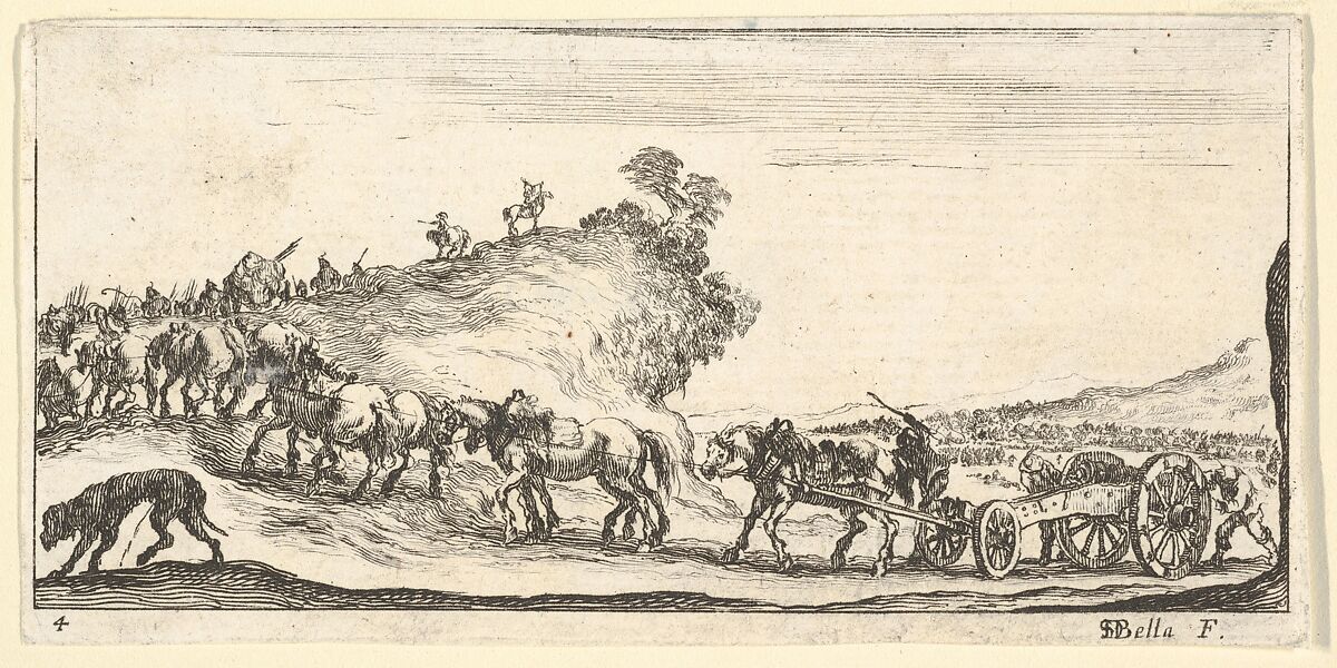 - Title: Plate 4: a procession of cannons and horses riding uphill towards the left, a dog at lower left, from "Troops, cannons, and attacks on towns" (Dessins de quelques conduites de troupes, canons, et ataques de villes)