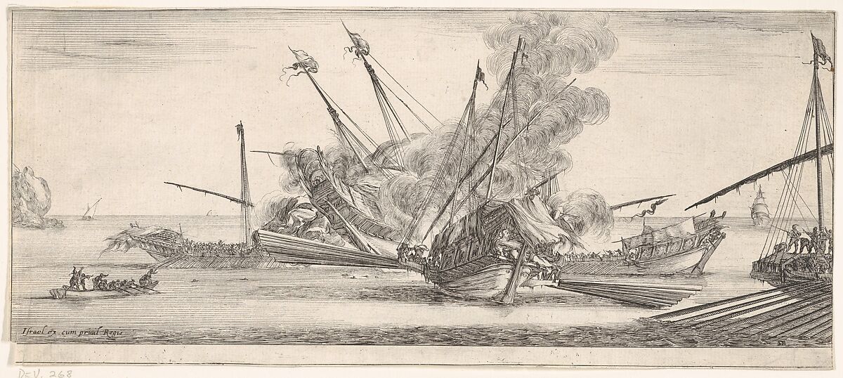 - Title: Naval combat, a ship at center, seen from behind, firing at four enemy ships, another ship entering from the right, a rowboat with nine people to left, from "Peace and War" (Divers desseins tant pour la paix que pour la guerre)