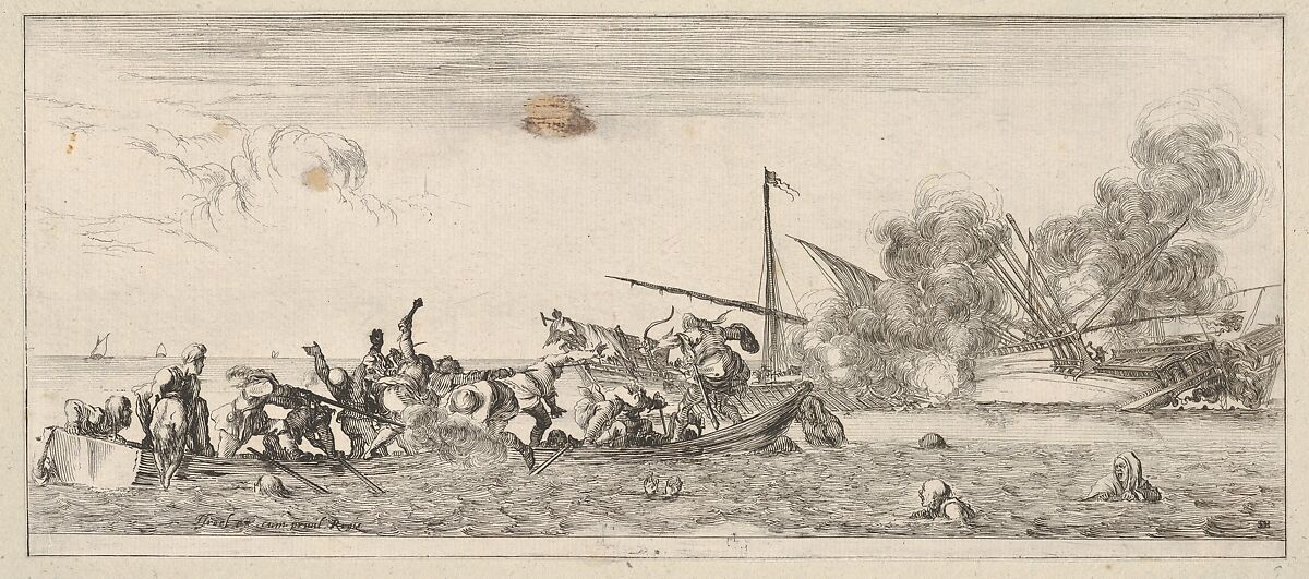 - Title:Naval battle, a rowboat filled with people fighting with muskets to left, people drowning in the sea in the center and right foreground, a ship on its side and burning in the background, from "Peace and War" (Divers desseins tant pour la paix que pour la guerre)