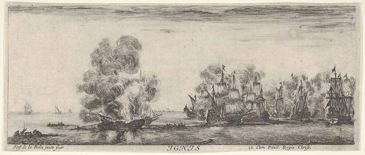 Fire, a flotilla on fire in center and to the right, two boats full of people to left, from "The Four Elements" (Les Quatre Eléments)
