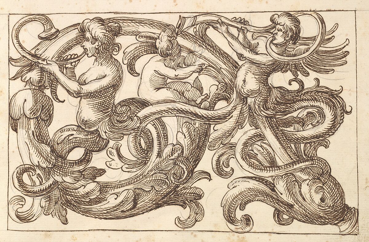 Design for a horizontal panel filled with a meandering acanthus rinceau. Two male figures, whose lower bodies consist of leaves and rinceaux are playing long, curved horns. In between them a putto is seated on the rinceau.