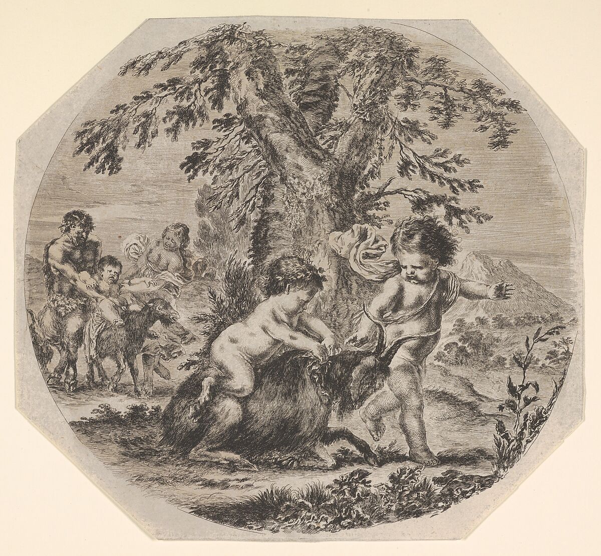 - Title:Two children playing with a goat in center, turned towards the right, a child satyr sitting atop the goat, the other child gesturing towards the right, a satyr and a woman watching their child ride a goat in the background