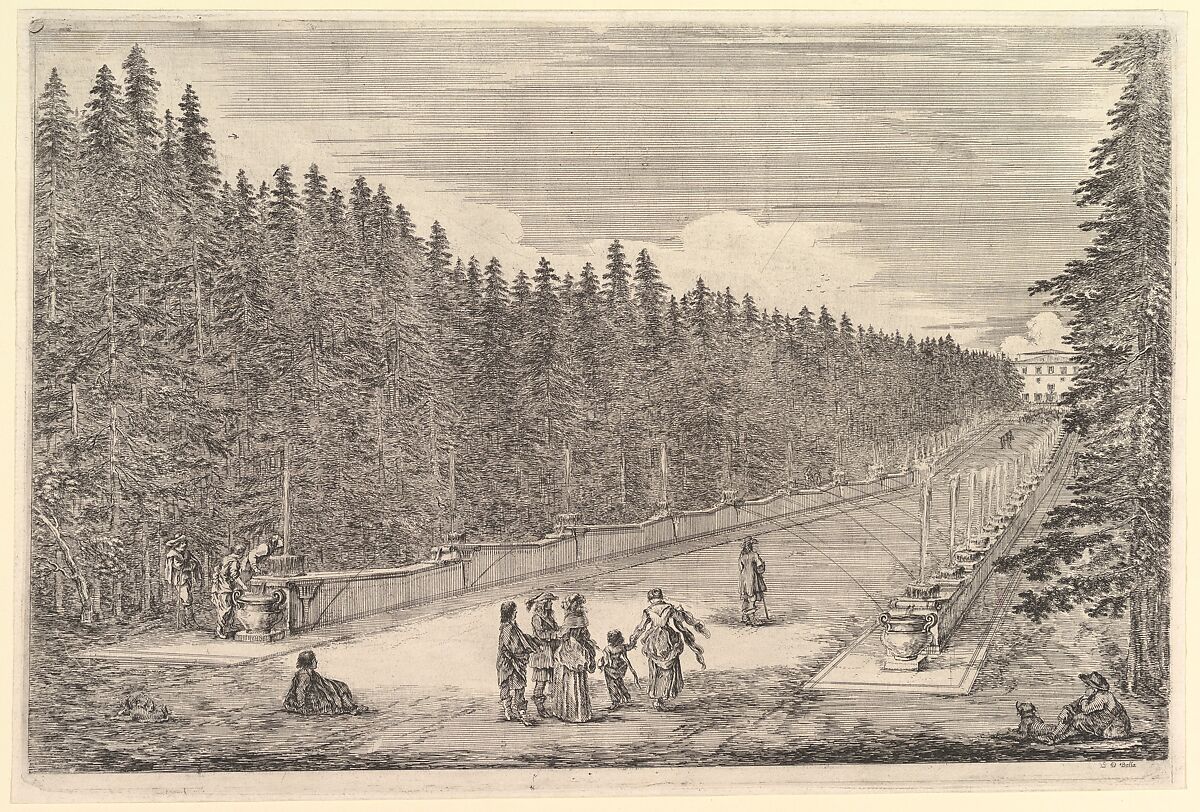 - Title:An alley of fountains, a group of people, from "Views of the villa at Pratolino" (Vues de la villa de Pratolino)