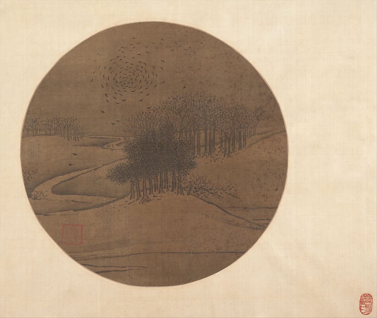 In this small landscape, groves of straight trees stand in snow. A pale, thin river threads its way to the horizon. This painting and others of austere wintry scenes may reflect the traditional Chinese belief that the natural world responds to human affairs. The twelfth-century historian Liu Zheng commented.