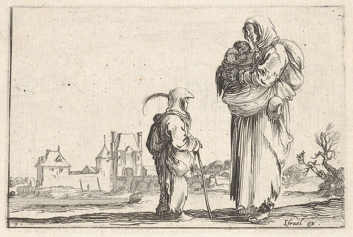 - Title: Plate 7: A peasant woman carrying a child to right, speaking to another child standing facing right in center, a castle to left in the background, from "Caprice faict par de la Bella"