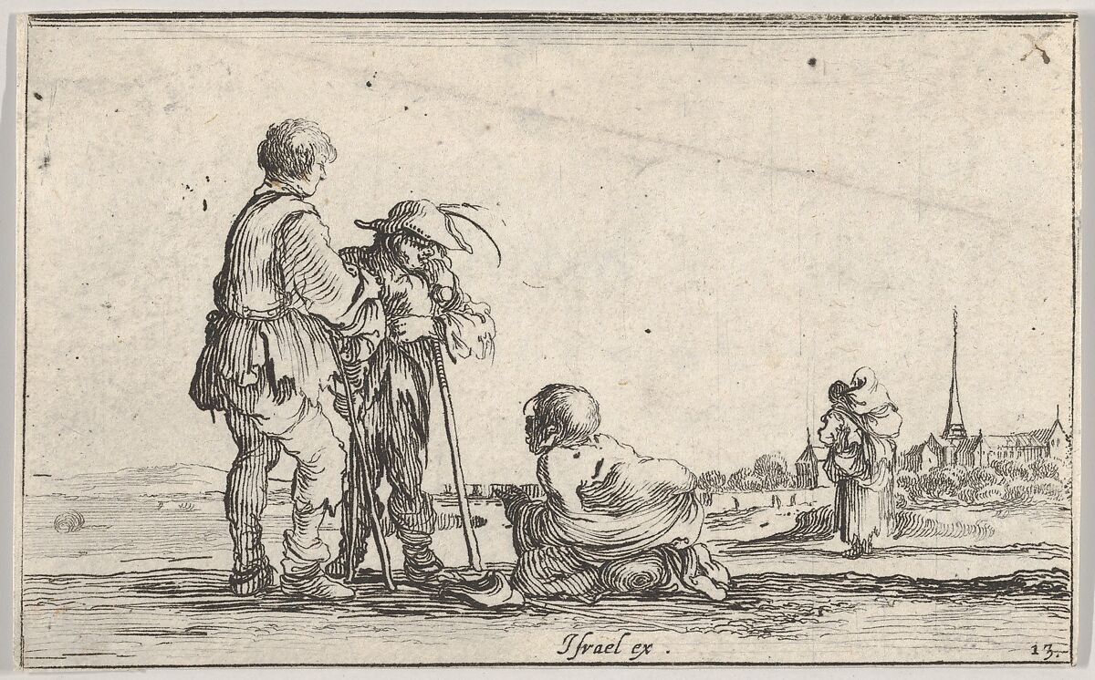 Plate 13: Two peasants standing to left, a cripple kneeling on the ground in center, a woman carrying a child seen from behind to right in middleground, a church to right in background, from "Caprice faict par de la Bella"