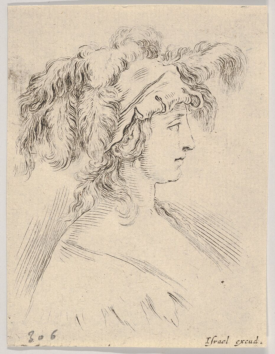 - Title: Plate 15: Mid-bust of a young woman in profile wearing a hat topped with feathers, from "The Book for Learning to Draw" (Livre pour apprendre à dessiner)
