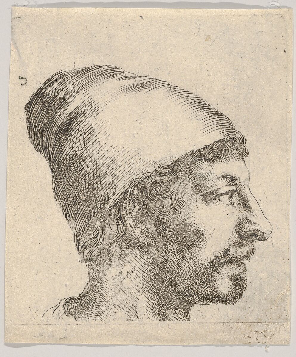 Plate 38: Head of a man with a moustache and cap, facing right in profile, from "Various Portraits" (Recueil de diverses pièces servant à l'art de portraiture)