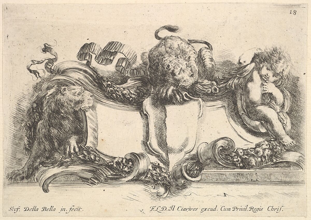 - Title: Plate 18: A cartouche containing an empty crest, two lionesses, one to left and one in center, an infant to right, from "Collection of various caprices and new inventions of cards and ornaments" (Raccolta di varii cappriccii et nove inventioni di cartelle et ornamenti)