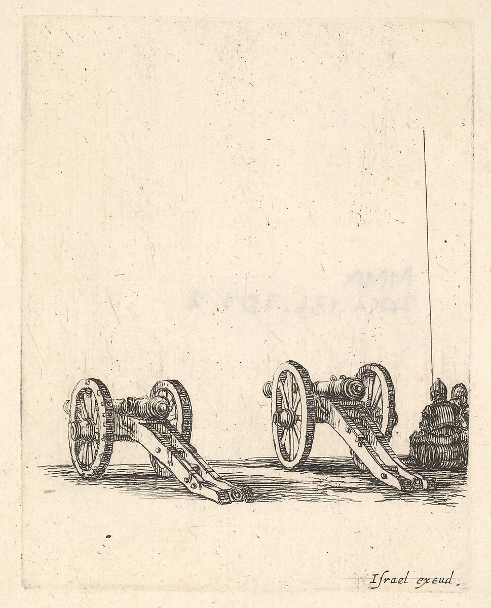 - Title:Two cannons, two soldiers seen from the back seated to the right, from "Equipment needed for Fortification" (Recueil de diverses pièces très nécessaires à la fortification)
