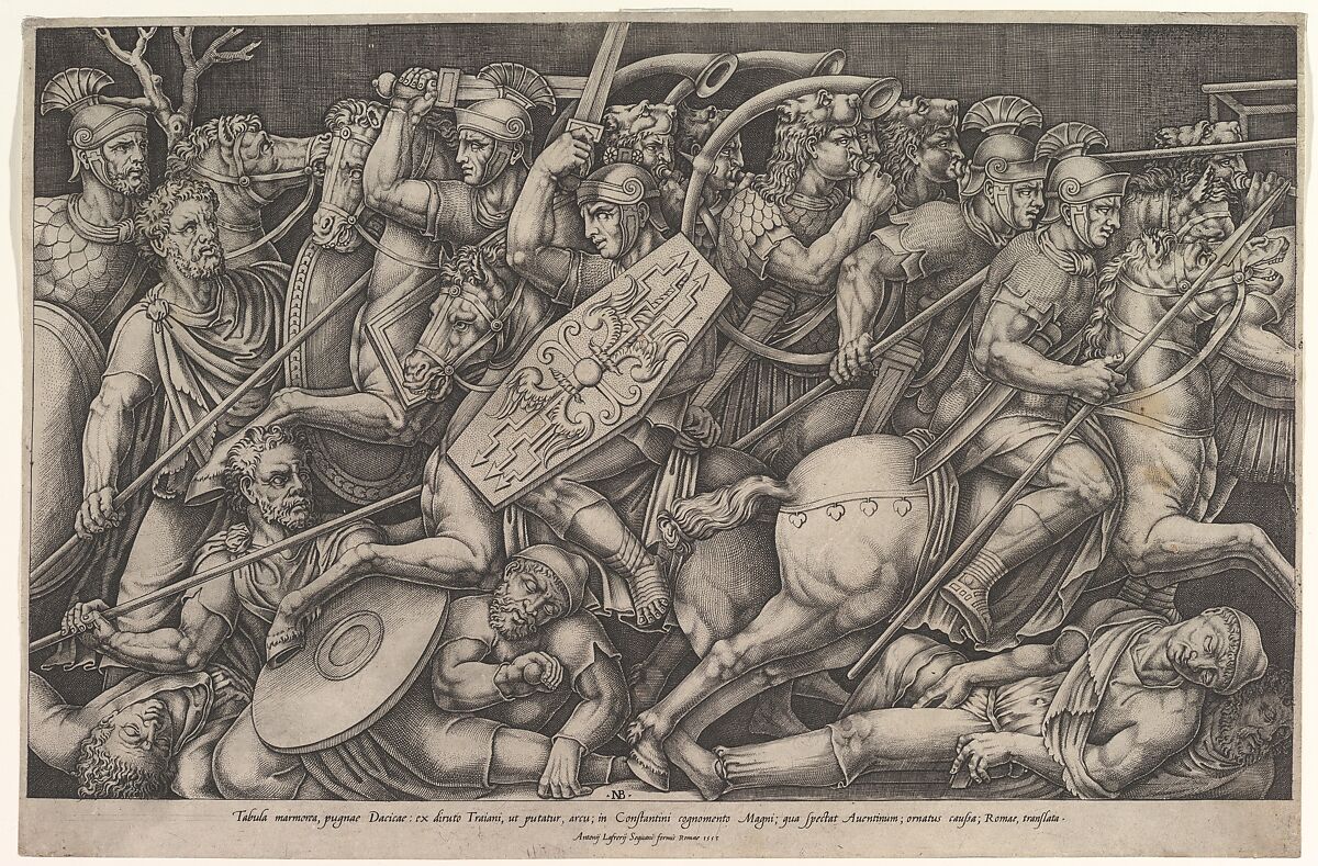 - Title: Roman soldiers fighting against Dacians, battle scene in shallow depth with horses and horn-players (after a bas-relief on the Arch of Constantine, Rome)