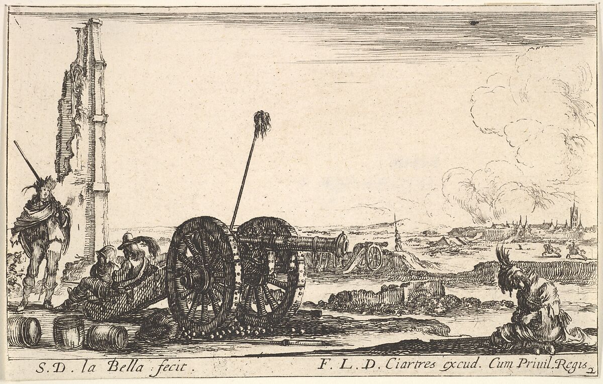 - Title:Plate 2: A cannon to the left, a town in the background, from "Various Military Caprices" (Varii capricci militari)