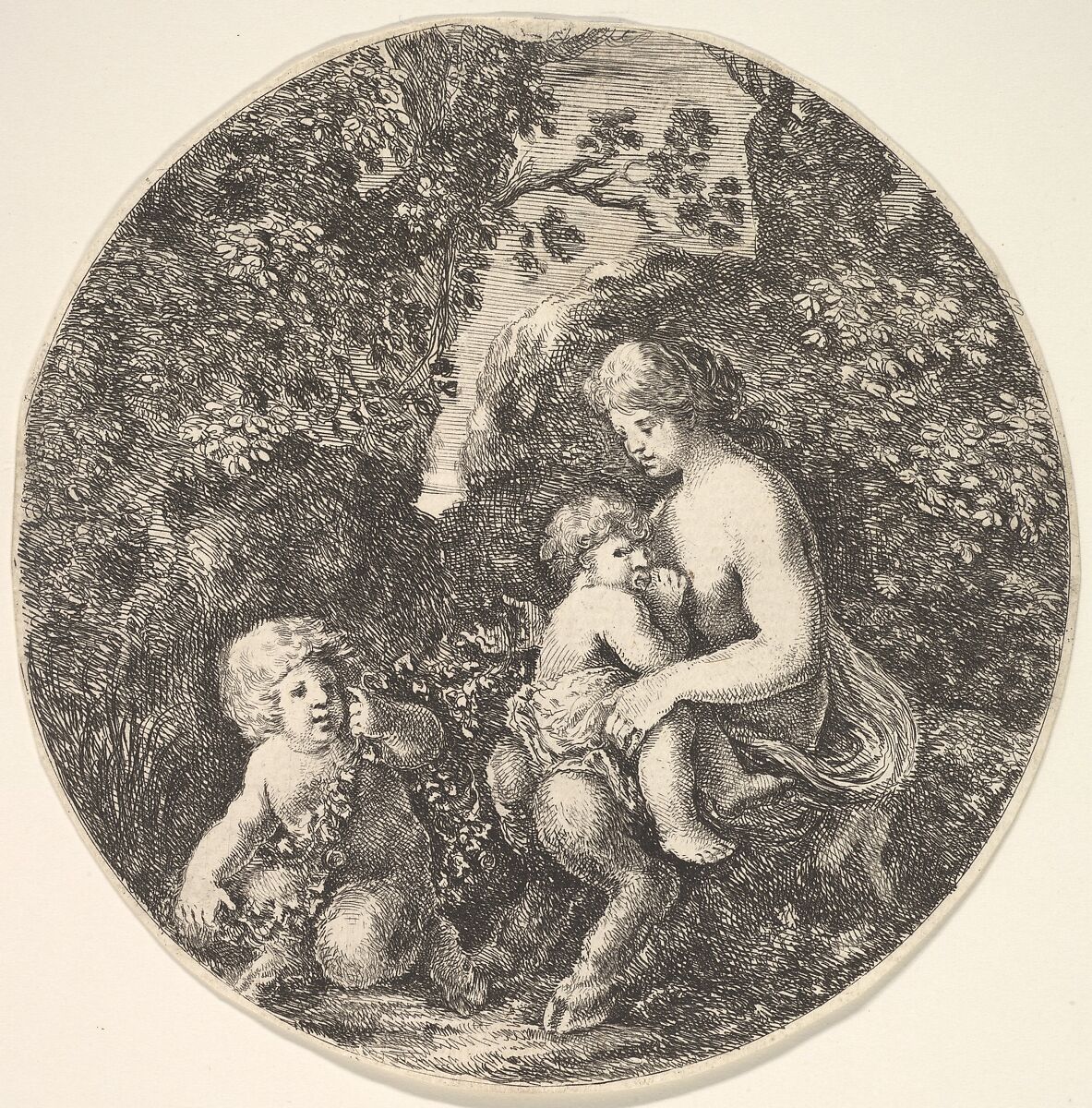 A female satyr breastfeeding an child to the right, turned towards the left, a satyr child on the ground to the left, from "Landscapes and seaports" (Paysages et ports de mer, dans des ronds)
