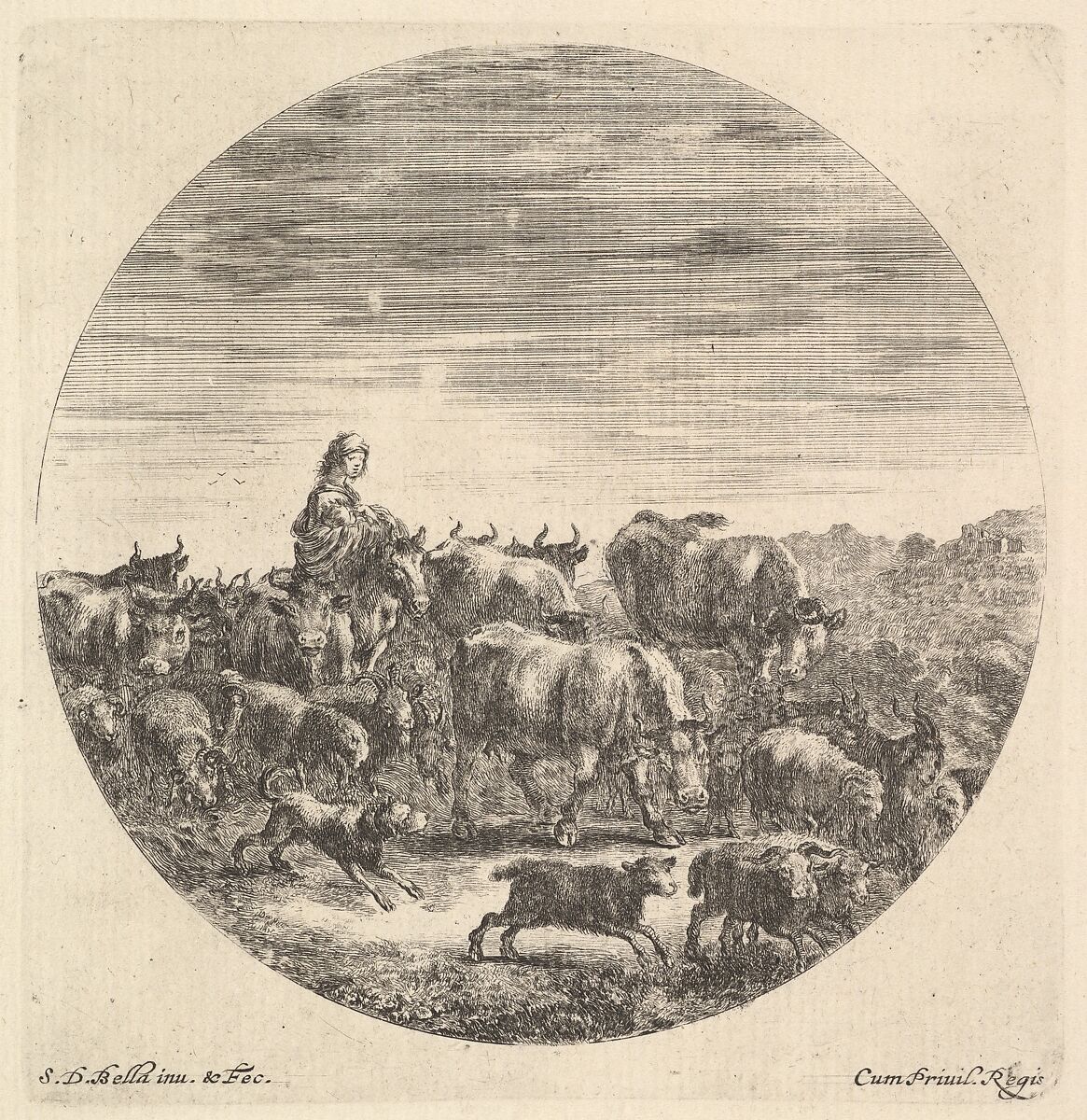 A peasant woman seated on a horse to left, facing right, surrounded by a herd of cows, goats, sheep, and dogs, from "Six Animal Subjects" (Six Sujets d'Animaux)