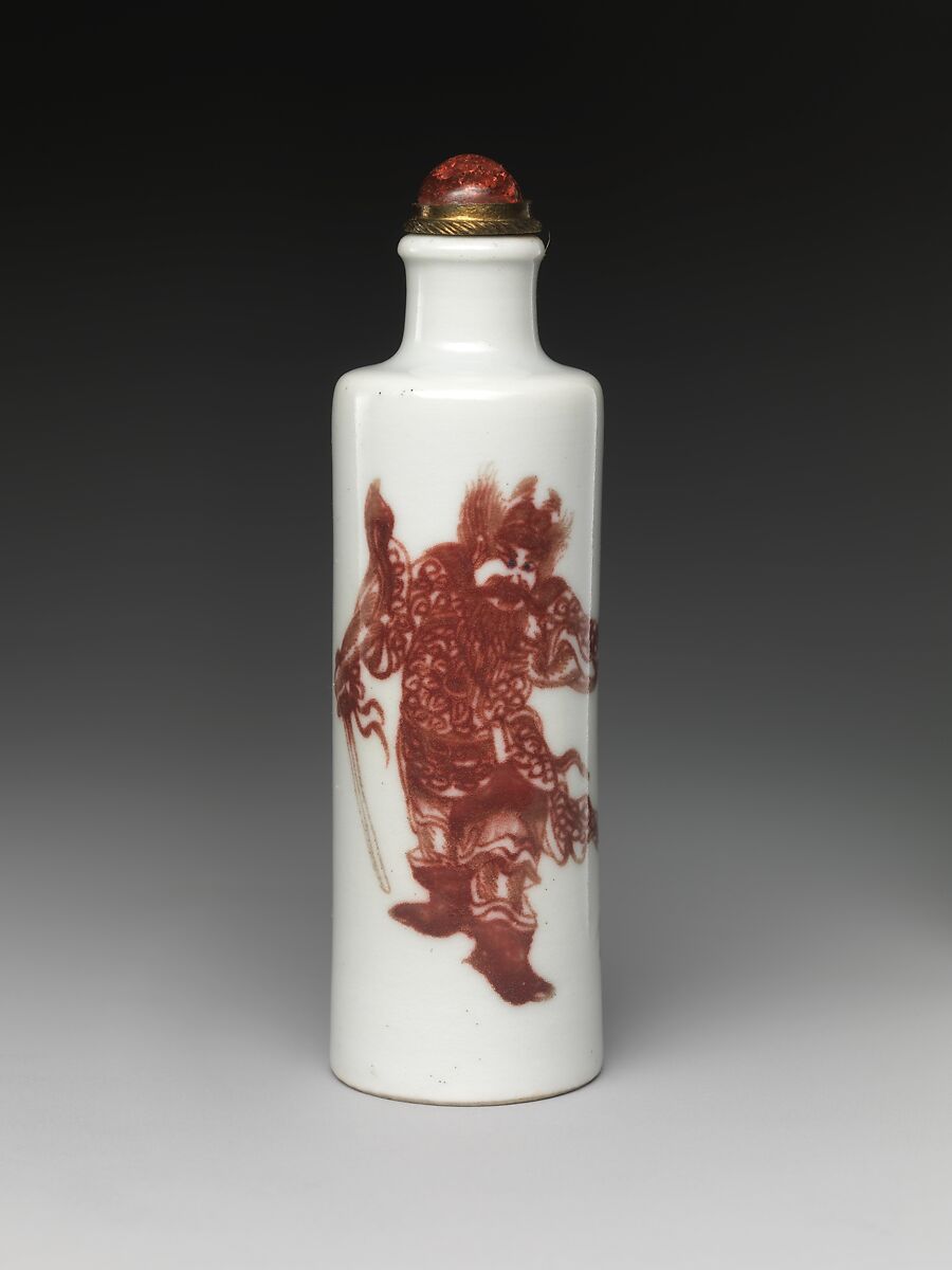 This fierce-looking figure is the legendary demon queller Zhong Kui. He is depicted in vibrant red paint on both sides of the bottle. A pale blue demon is painted on the object’s underside, which implies it was crushed under Zhong Kui’s feet.