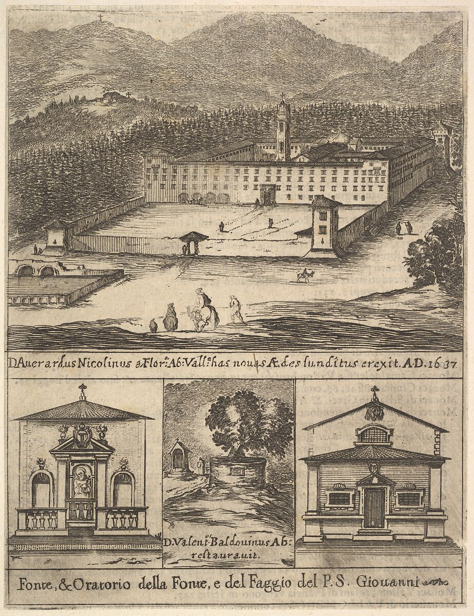 - Title: Four views: at top, a view of the new monastery of Vallombrosa, at bottom left and right, a view of a chapel, at bottom center, the tree of St. John Gualbert, from "Frontispiece and four scenes from the life of Saint John Gualbert" (Frontispice et quatre vignettes pour une vie de Saint Jean Gualbert)