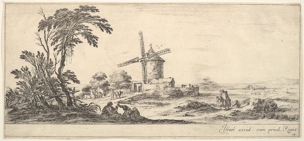 - Title:Plate 10: a family in center foreground, various figures and horses in middleground, a windmill in center background, from "Various Landscapes" (Divers Paysages)
