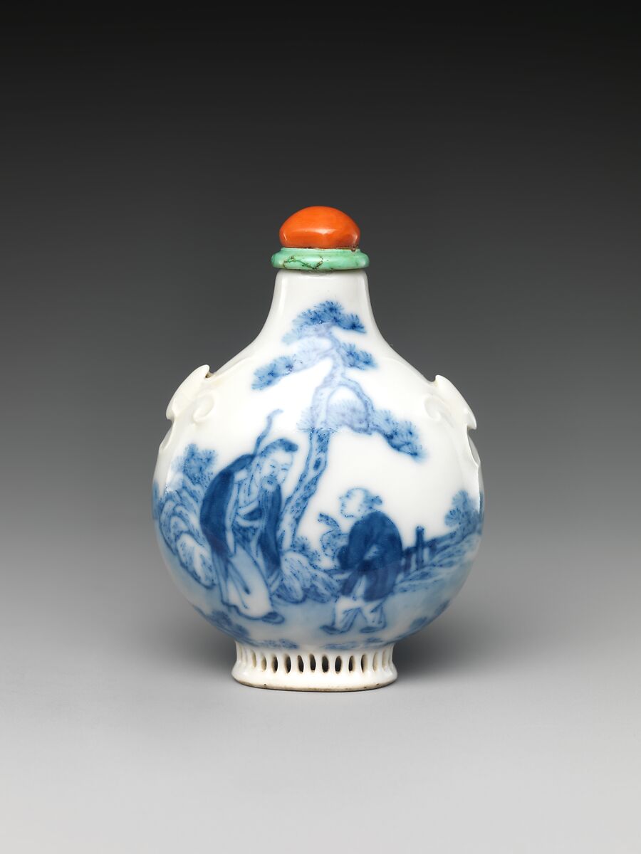 - Medium: Porcelain with underglaze blue, coral stopper