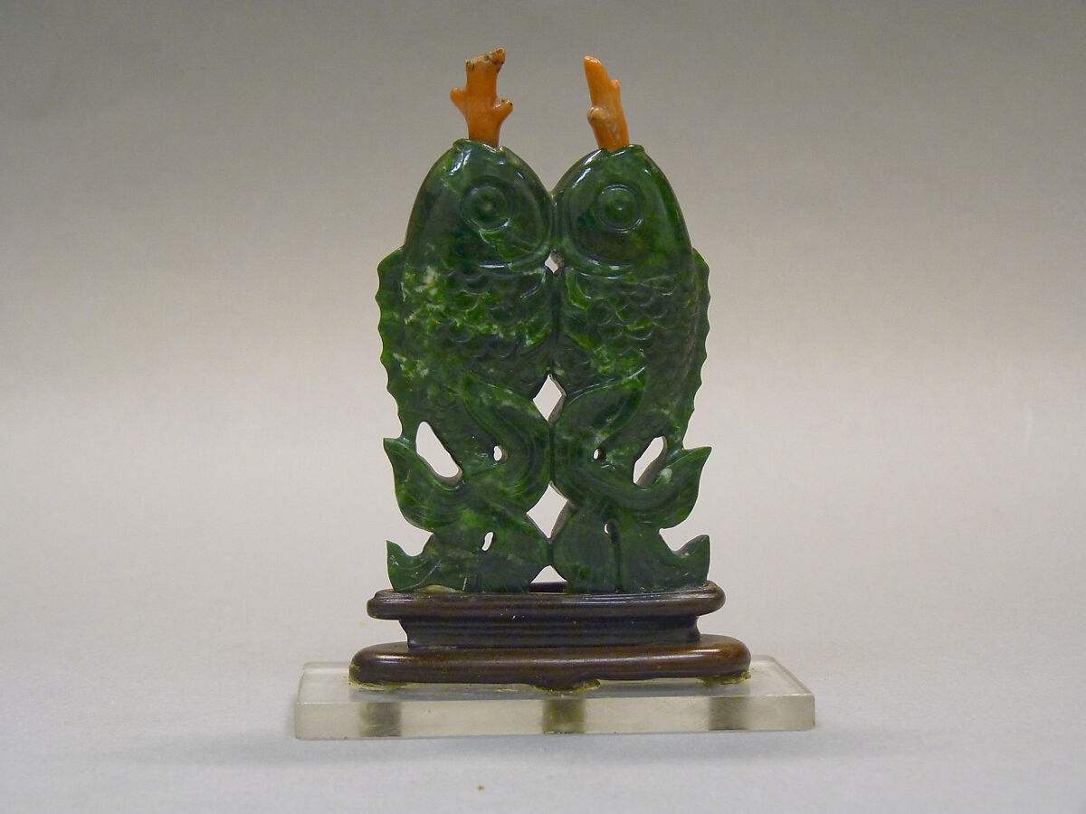 - Medium: Chloromelanite jadeite with coral stoppers; wood stand