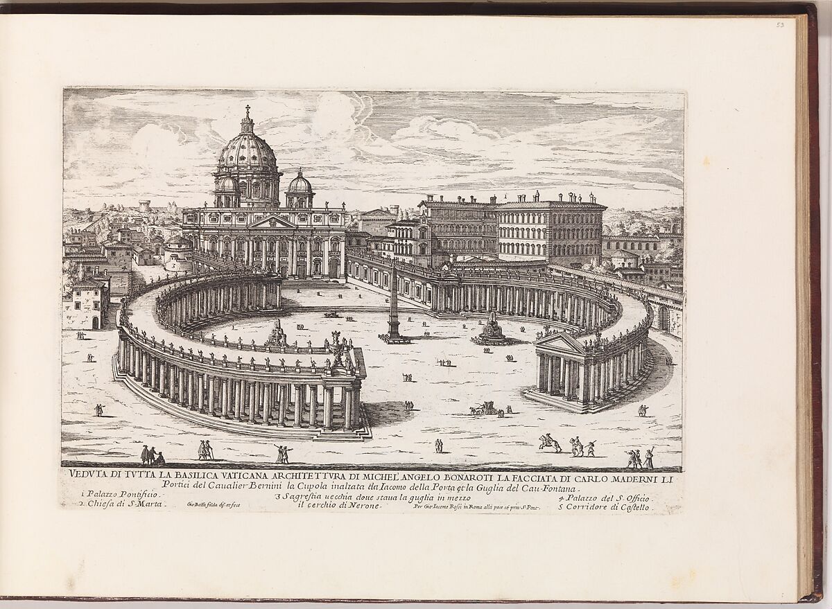 Bird's-eye view of Saint Peter's Basilica with the the square and arcade in front, portrayed at an angle. Bernini's arcade is depicted in its final stage (as opposed to plate 31.67.4(1). Numbers are added near several notable buildings and monuments which are identified below the image.
