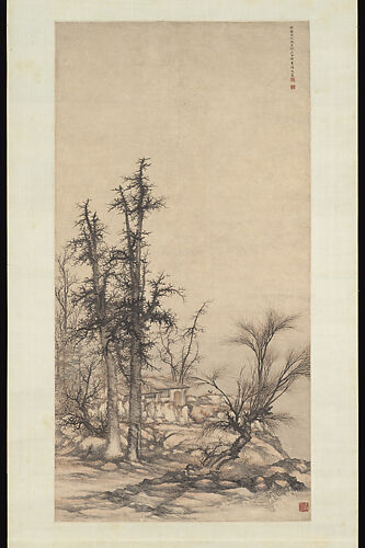 A refuge since its discovery in the fourth century, Mount Tiantai is a legendary dwelling place of Buddhist holy men; its natural stone bridge is a fabled point of connection between this world and the paradise of the immortals. Dai Benxiao, whose Ming-loyalist father committed suicide after being injured in a battle against Qing forces, focuses here on the mountain's pines. Symbolic of survival in times of adversity, the pines, having been suddenly threatened, reflect the artist's uncertainty about his ability to find spiritual sanctuary in a world from which he feels alienated: