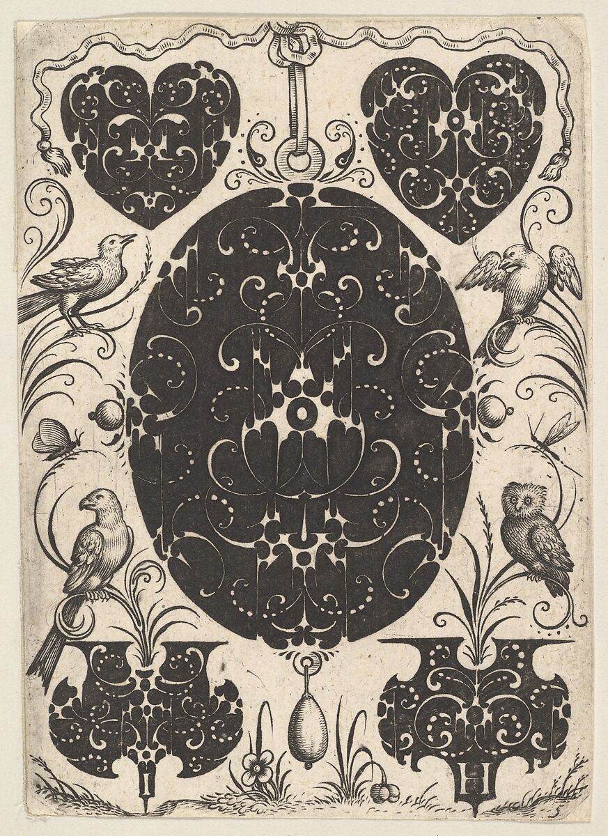 - Title: Oval Pendant Decorated with Schweifwerk, Surrounded by Smaller Motifs and Four Birds