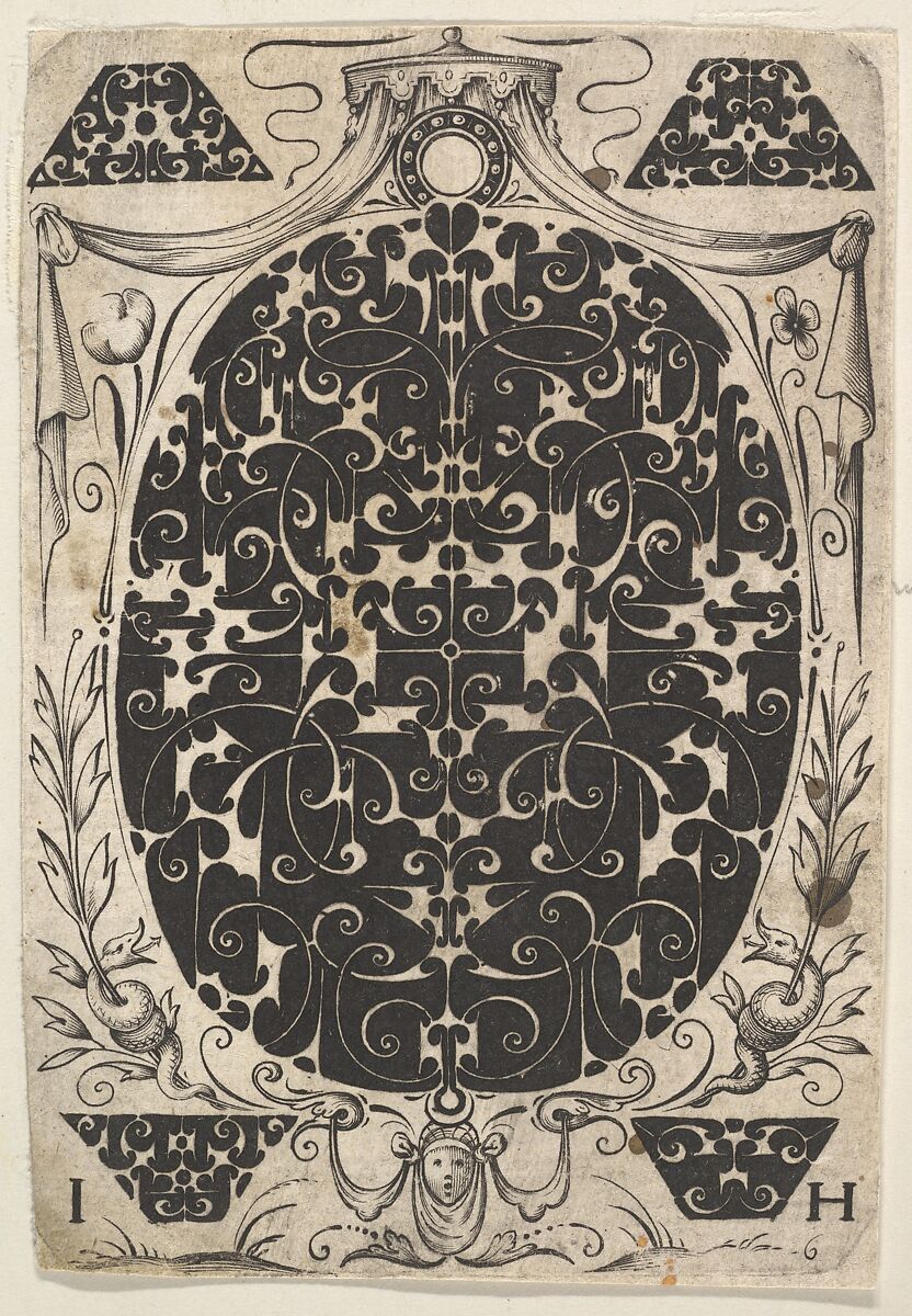 Part of a series of 6 with goldsmiths designs executed in the blackwork technique. Design for an oval pendant, presumably the reverse of a watch case or medaillon, decorated with Schweifwerk. The design is surrounded by four smaller motifs in the shape of a trapezoid also done in blackwork. Crowning the pendant is a small baldachin which is executed in engraving like the other decorative elements in the print.