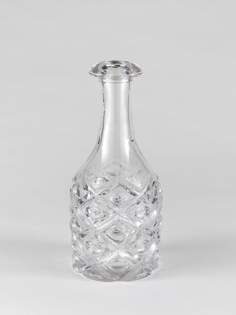 With the development of new formulas and techniques, glass-pressing technology had improved markedly by the late 1840s. By this time, pressed tablewares were being produced in large matching sets and innumerable forms. During the mid-1850s, colorless glass and simple geometric patterns dominated. Catering to the demand for moderately-priced dining wares, the glass industry in the United States expanded widely, and numerous factories supplied less expensive pressed glassware to the growing market. At the Exhibition of the Industry of All Nations at New York’s Crystal Palace in 1853, for example, the New England Glass Company exhibited 130 pieces of one design, "consisting of bowls, tumblers, champagnes, wines, and jelly glasses." This object belongs to one such service. Although the glass manufactory is not known, the glassware is very typical of the large services that were very popular with America’s middle class in the nineteenth century.