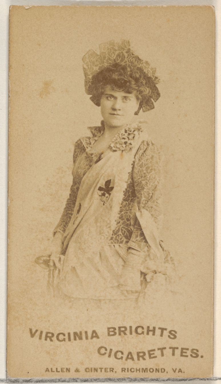 Trade cards from the "Actors and Actresses" series (N45, Type 5), issued ca. 1888 by Allen & Ginter to promote Virginia Brights, Dixie, Our Little Beauties and Opera Puffs Cigarettes.