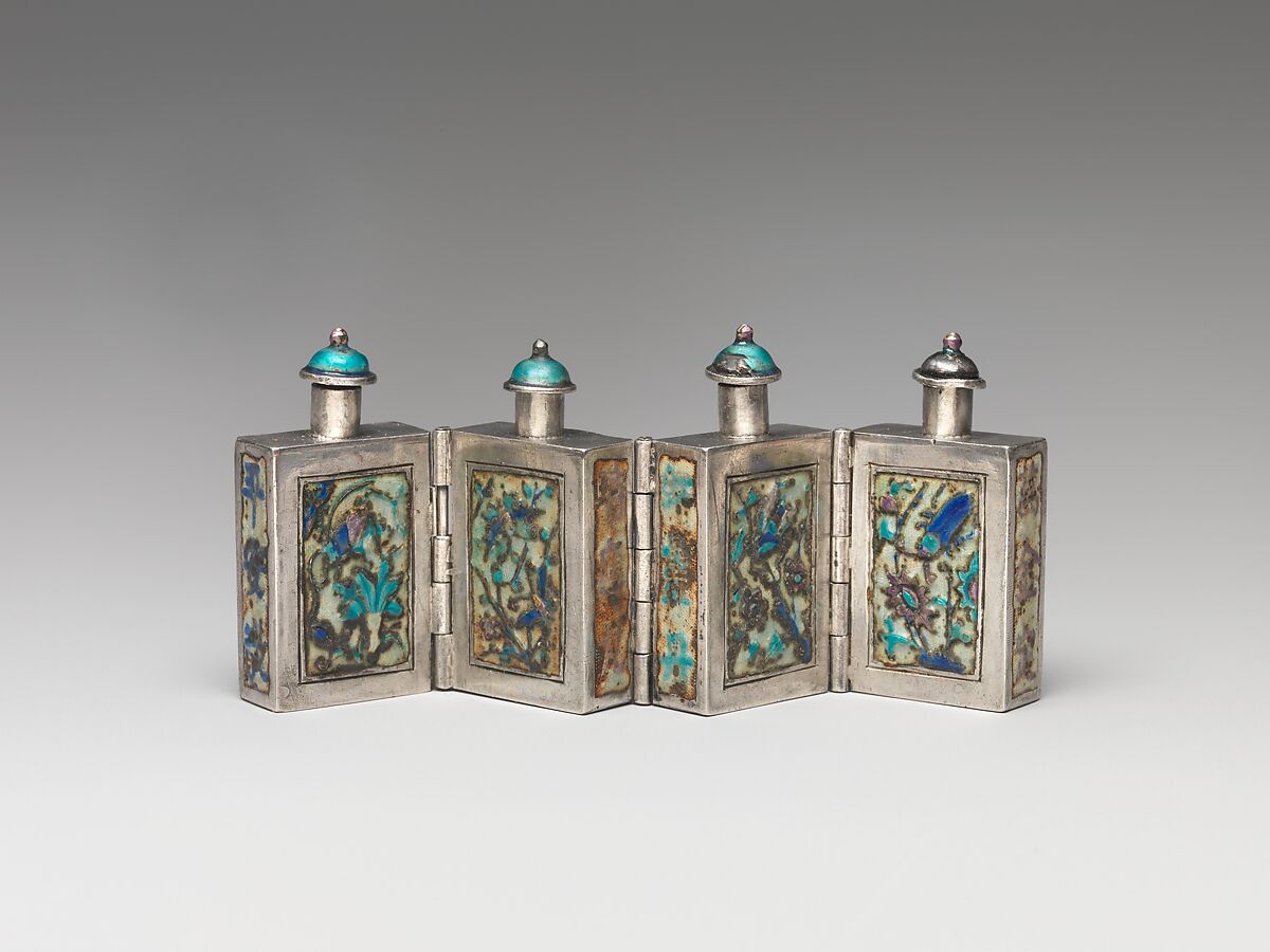 - Medium: Silver with painted enamel panels and enamel stoppers