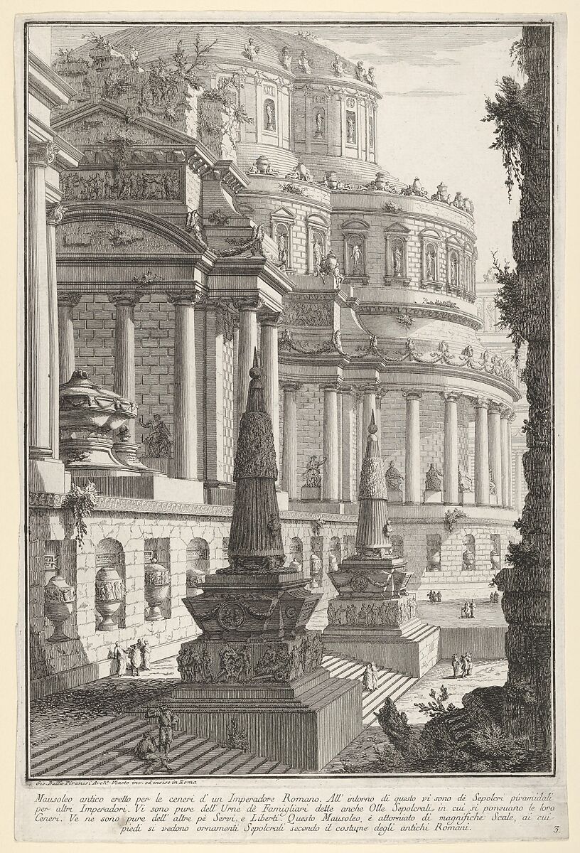 - Title: Plate 3: Ancient mausoleum erected for the ashes of a Roman emperor (Mausoleo antico eretto per le ceneri d'un imperadore romano), from "Part one of architecture and perspectives: drawn and etched by Gio. Batt'a Piranesi, Venetian Architect: dedicated to Nicola Giobbe" (Prima parte di Architetture, e prospettive inventate, ed incise da Gio. Batt'a Piranesi Architetto Veneziano dedicate al Sig. Nicola Giobbe)