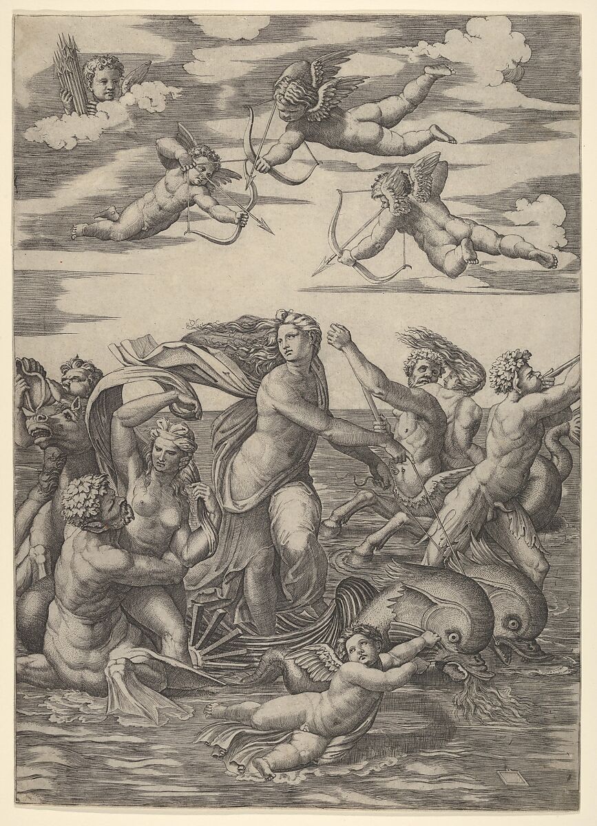 - Title: Galatea standing in a water-chariot pulled by two dolphins, surrounded by tritons, nereids, and putti, three of which prepare to shoot arrows from above